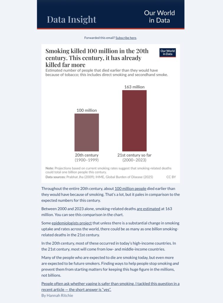Tabakprodukte enthalten über 7000 giftige Chemikalien, die beim Wegwerfen in die Umwelt gelangen.Rund 4,5 Billionen Zigarettenfilter landen jedes Jahr in Ozeanen und Flüssen, auf Trottoirs und Böden und an Stränden. Die Kosten für die Beseitigung weggeworfener Tabakerzeugnisse tragen dabei immer die Steuerzahler und nicht die Industrie. Dies kostet China jährlich etwa 2,6 Milliarden Dollar und Indien etwa 766 Millionen Dollar. Die WHO fordert Länder und Städte auf, die Industrie bei der Beseitigung der Tabakreste stärker in die Pflicht zu nehmen. Ausserdem soll die Politik ein Verbot von Zigarettenfiltern in Betracht ziehen. Diese enthalten Mikroplastik und tragen stark zur Plastikverschmutzung bei. Ihr gesundheitlicher Nutzen ist hingegen nicht nachgewiesen, so die WHO. (Mai 2022)
