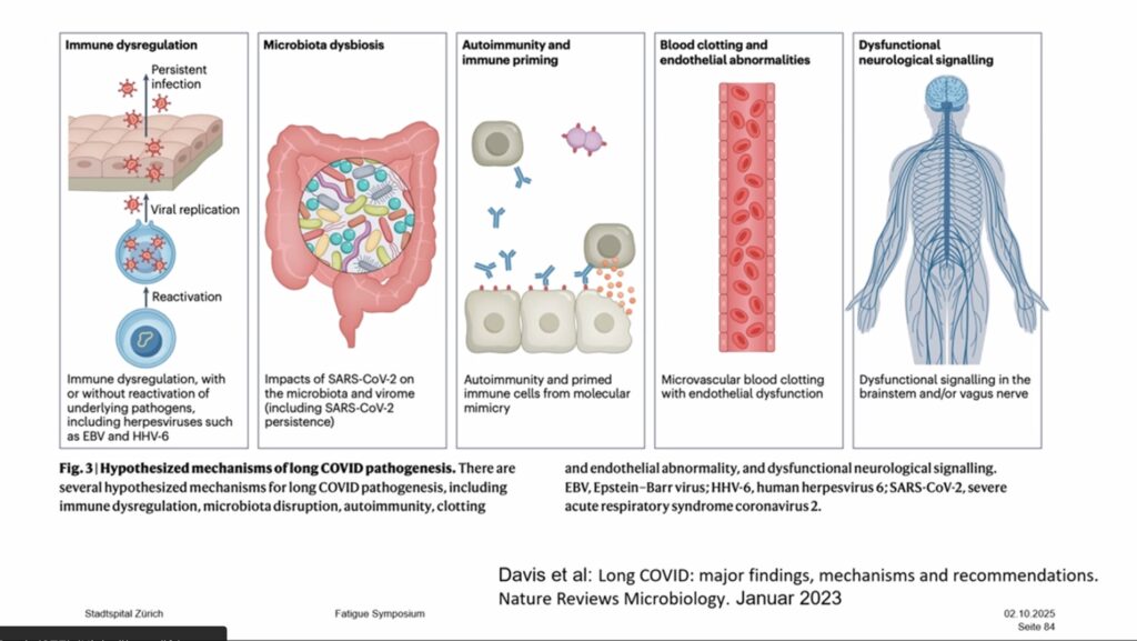 Wir gehen davon aus, dass die sogenannten postakuten Infektionssyndrome, zu denen auch ME/CFS gehört, die Folge verschiedener Infektionen sein können. ME/CFS, das wussten wir schon vor Korona, kann von verschiedenen Viren, Bakterien und Parasiten getriggert werden, zum Beispiel von EBV und Grippe, nach Chlamydien, aber auch von Borrelien, die von Zecken übertragen werden. Korona ist nun ein weiteres Mitglied dieser Gruppe. Das zeigt, dass wahrscheinlich nicht ein einzelnes Oberflächenmolekül oder etwas Ähnliches für diese Infektionssyndrome verantwortlich sein kann. Die Infektionen sind nur eine Art Trigger.